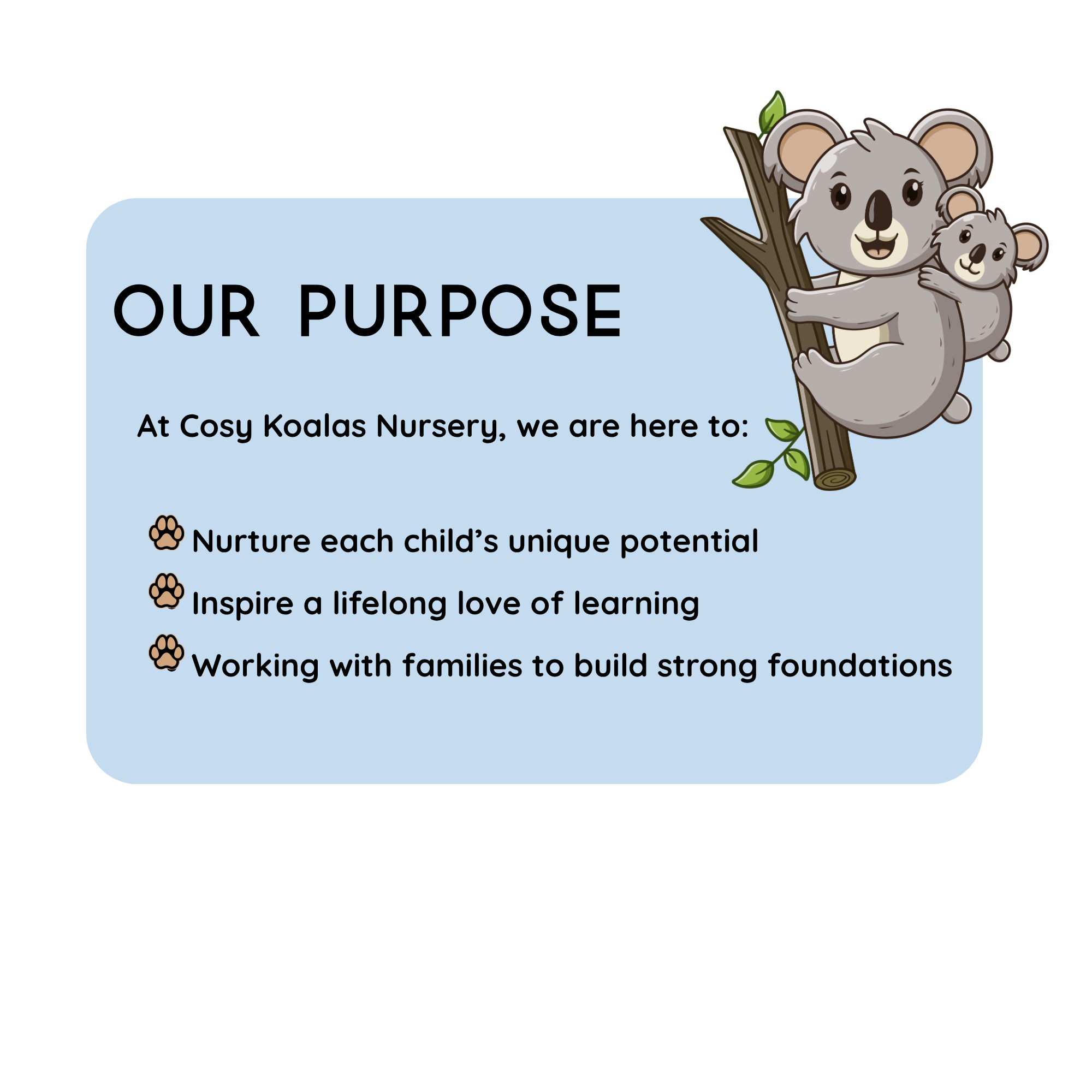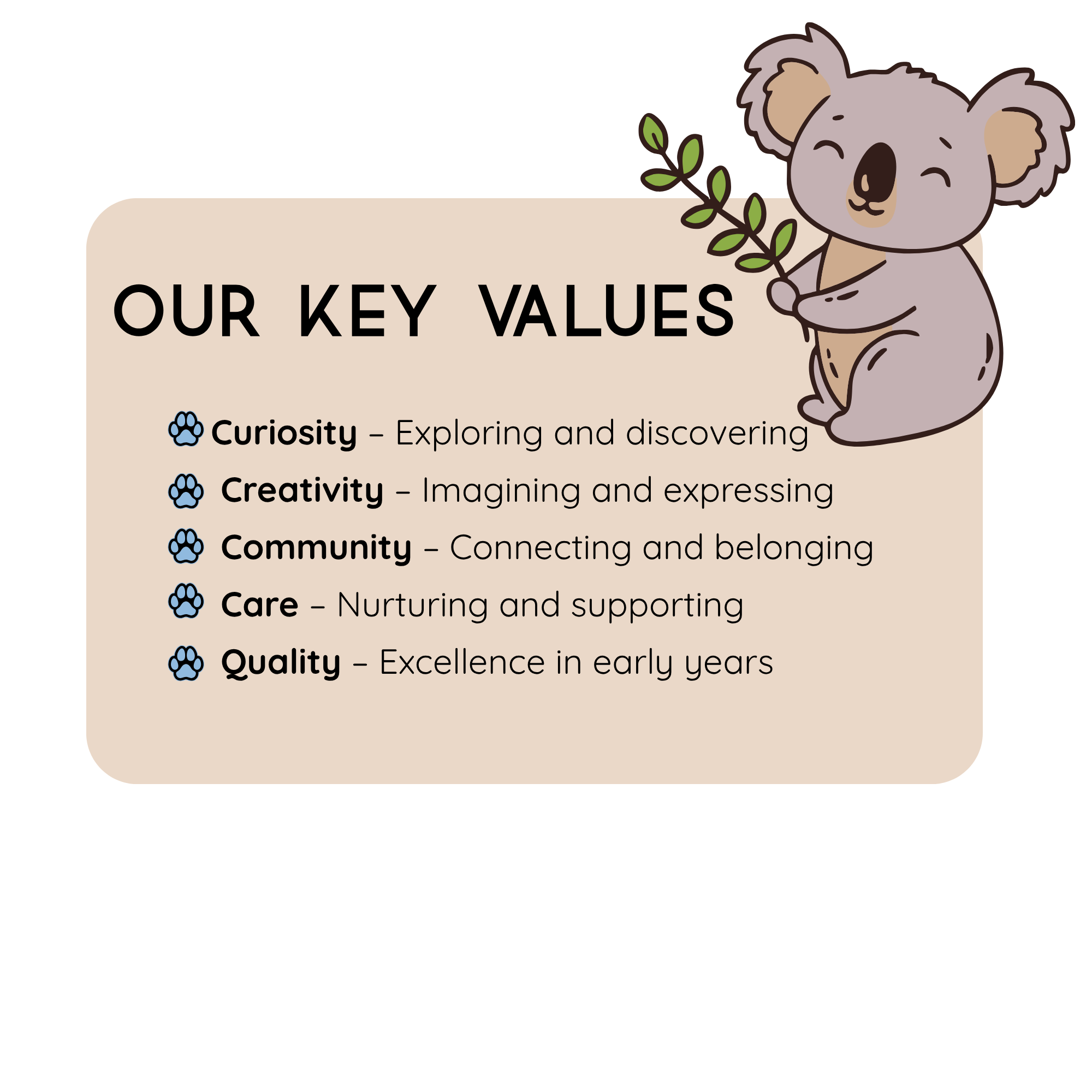 At Cosy Koalas Nursery, our values are rooted in nurturing care, respect, and a love for learning. We create a warm and supportive environment where children feel safe, valued, and encouraged to explore, grow, and develop with confidence.